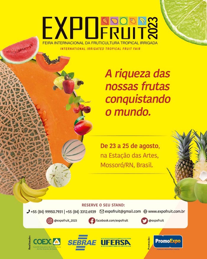 A maior feira internacional da fruticultura irrigada vem aí! A Expofruit 2023 está se aproximando, com data prevista para os dias 23 a 25 de agosto de 2023, na Estação das Artes, Mossoró/RN. Não perca esta oportunidade e venha participar deste grande evento!