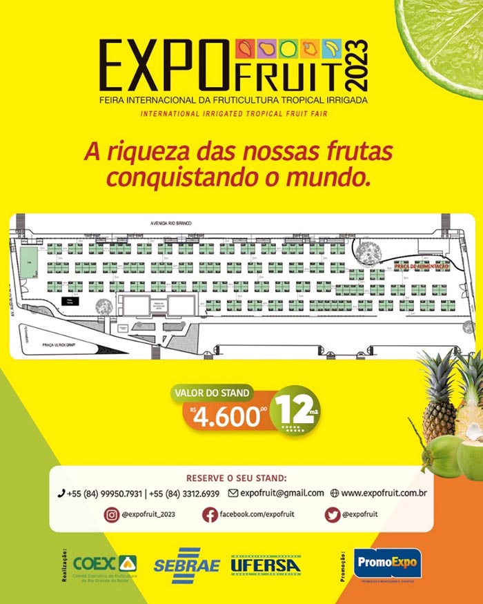 Realize a reserva do seu stand por meio dos telefones (84) 99950-7931/ (84) 3312-6939, pelo e-mail expofruit@gmail.com ou ainda em no site www.expofruit.com.br