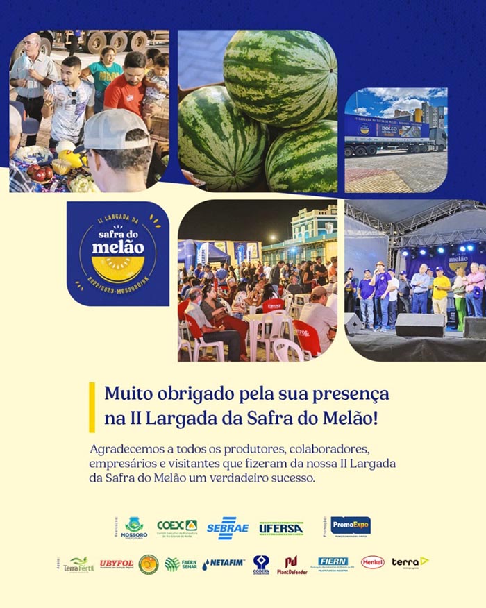 A 2ª Largada do Melão foi um sucesso absoluto! Agradecemos a todos os produtores, colaboradores, empresários e visitantes que participaram deste grande evento, pela dedicação e empenho em realizar este momento ímpar, fortalecendo a importância da fruticultura local e regional para o desenvolvimento nacional e possibilitando novas oportunidades de crescimento para o futuro!